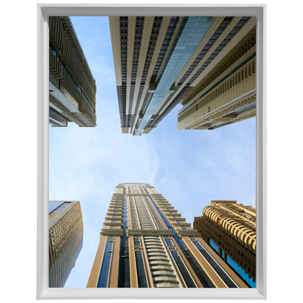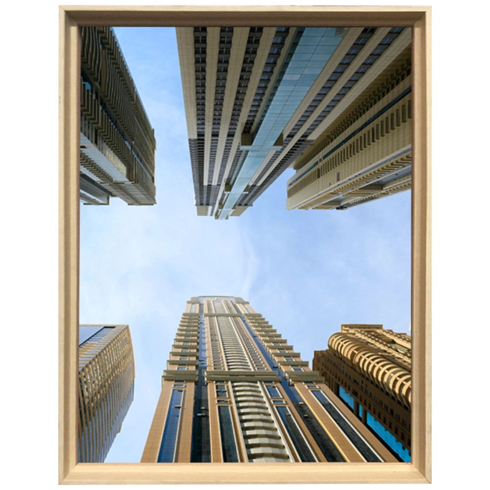 Ideal para telas em chassi de madeira, seu design em formato de escada proporciona um espaçamento elegante entre a tela e a moldura, sem uso de vidro, valorizando a textura da obra.